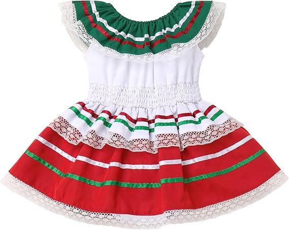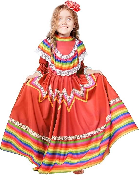 Mexican Dress for Girls Mexican Traditional Folk Ruffle Drape Dress with Belt Mexican Carnival Birthday Party Dress