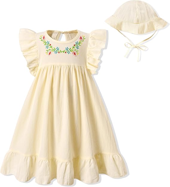 Toddler Girl Dress Cotton Linen Ruffle Sleeve Beach Dresses Kids Summer Sundress with Hat