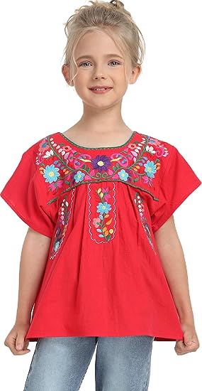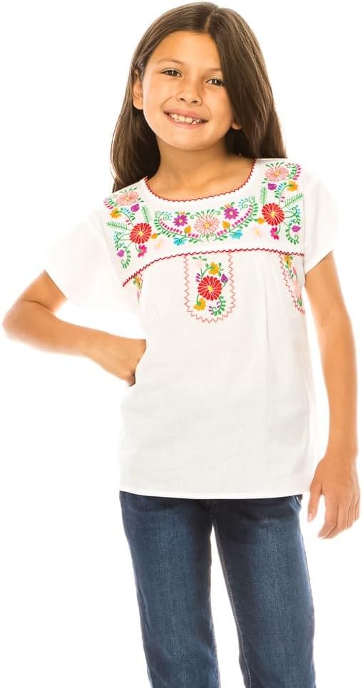 Mexican Blouse for Girls Traditional Embroidered Summer Short Sleeve Peasant Blouse for Kids