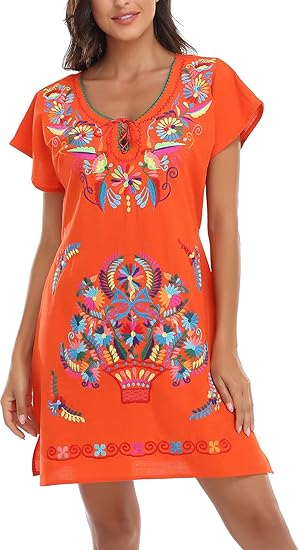 Women Mexican Embroidered Fiesta Dress V Neck Dress Short Sleeve