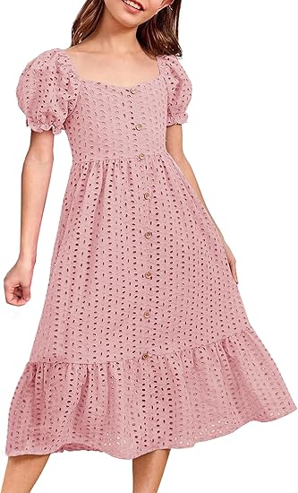 Girls Summer Square Neck Puff Sleeve Boho Ruffle Tiered A-line Casual Party Midi Dress for 6-12 Years
