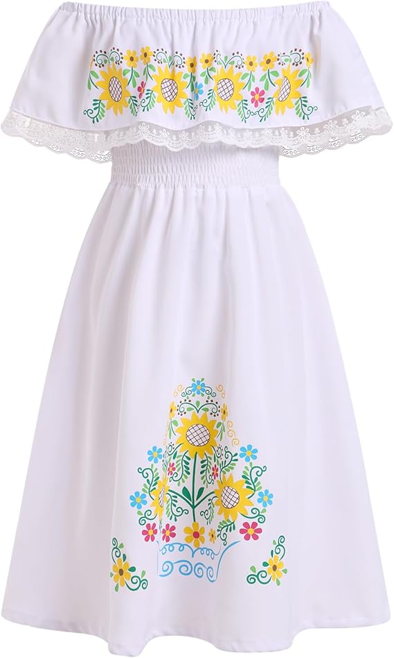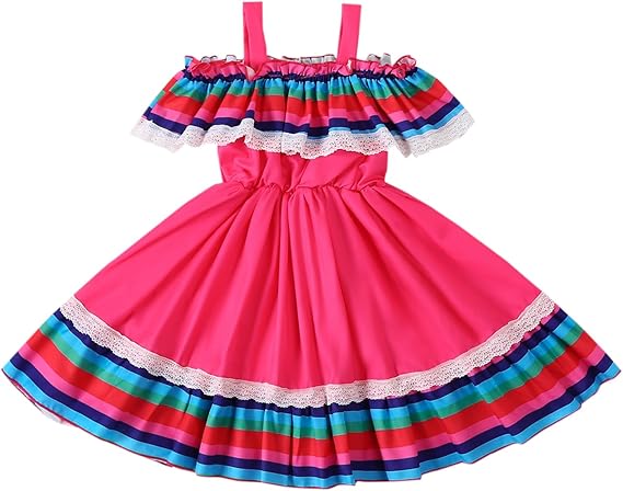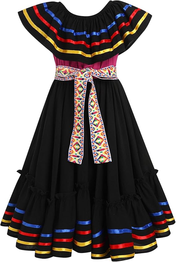 Kids Girls Cinco De Mayo Fiesta Mexican Traditional Folk Ruffle Drape Dress with Belt