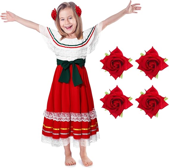 5 Pcs Mexican Fiesta Dress Kit Traditional Mexican Girl Dress with Rose Hair Clip for Cinco De Mayo Halloween