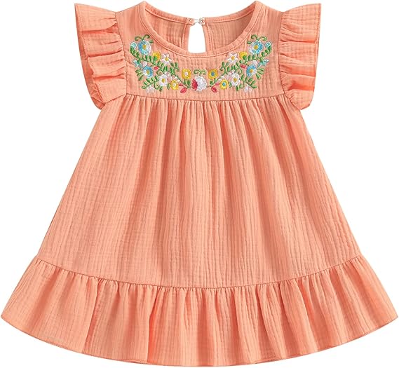 Kids Toddler Baby Girl Summer Cotton Linen Dress Flying Sleeve Mexican Ethnic Embroidery Floral Sundress Casual Dress