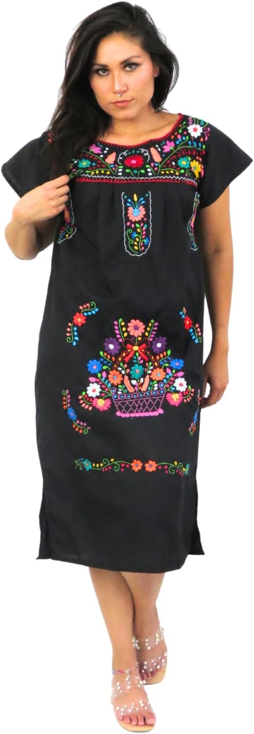 Traditional Mexican Tehuacan Embroidered Women's Summer Floral Dress for Fiestas, Casual, Cultural & Weddings