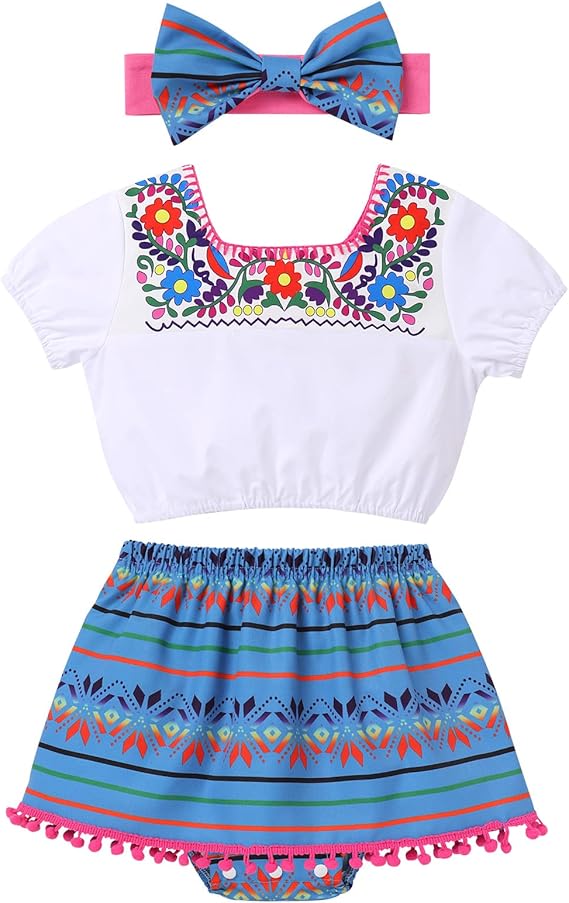 Toddler Baby Girls First Mexican Cinco De Mayo Fiesta Outfits Crop Top Mini Skirt Headband Summer Clothes 3PCS Set