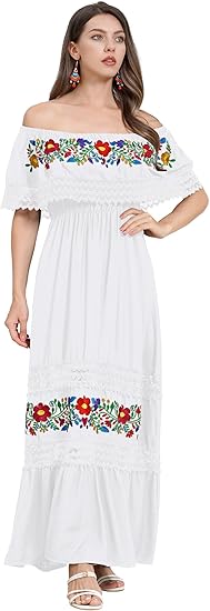 Women Mexican Dress Off Shoulder Floral Embroidered Long Maxi Dress Summer Beach Party Cinco de Mayo Dresses