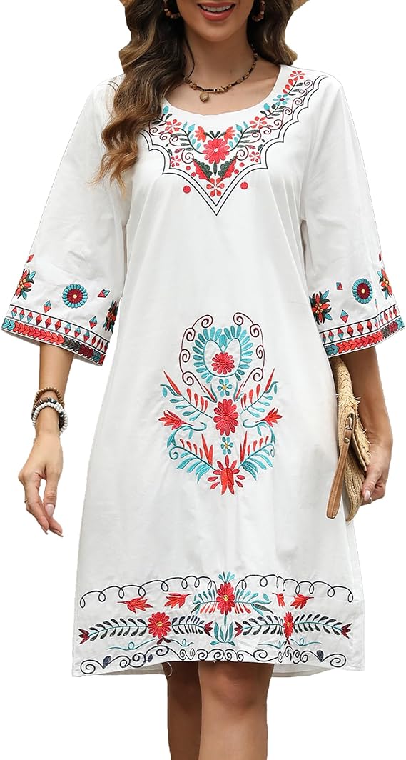 Women's Embroidered Mexican Peasant Dresses Boho Fiesta Traditional Floral Dress Casual Fall Dresses for Women