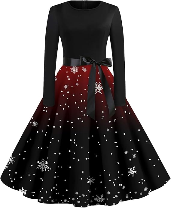 Women's Fashion Vintage Long Sleeve Round Neck Christmas Printed Party Gown Dress Vestidos Elegantes De Mujer
