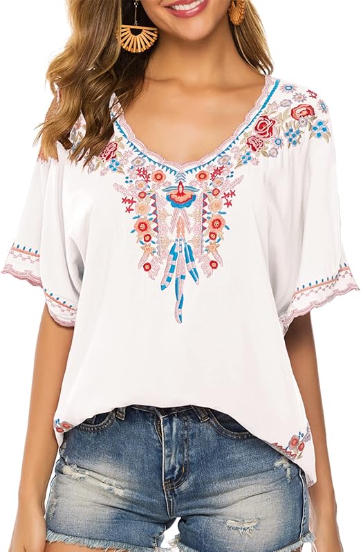 Mexican Boho Tops for Women Embroidered Shirts Summer Short Sleeve Clothing Plus Size Peasant Tunic Blouse