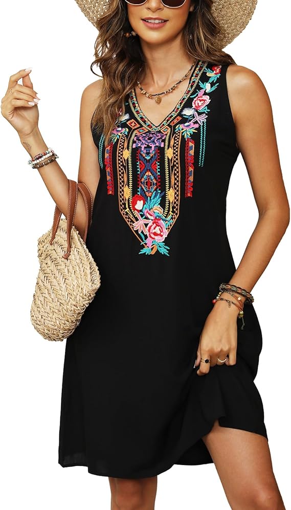 Women's Mexican Embroidered Dress Traditional Fiesta Boho Style Floral Sleeveless Dresses Ladies Summer Sundresses