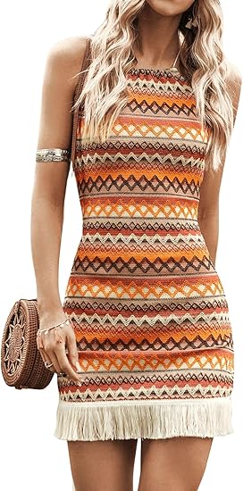 Women's Sleeveless Halter Neck Striped Chevron Print Fringe Hem Boho Cami Mini Dress