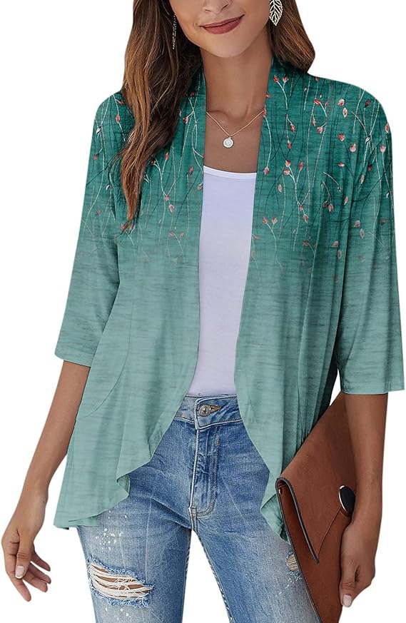 Cardigan for Women Draped Ruffles Printed Casual Tops 3/4 Sleeves Lightweight Open Front Shirts