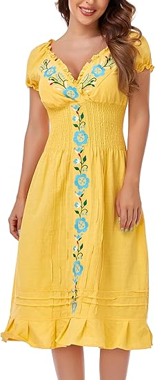 Mexican Embroidered Dresses for Women Boho Peasant Traditional Fiesta Bohemian Floral Long Dress
