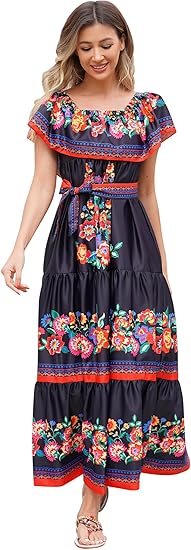 Women Mexican Dress Off Shoulder Floral Summer Casual Long Maxi Dress Beach Party Cinco de Mayo Dresses with Belt