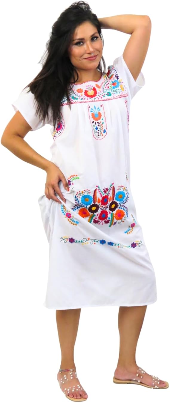 Traditional Mexican Tehuacan Embroidered Women's Summer Floral Dress for Fiestas, Casual, Cultural & Weddings