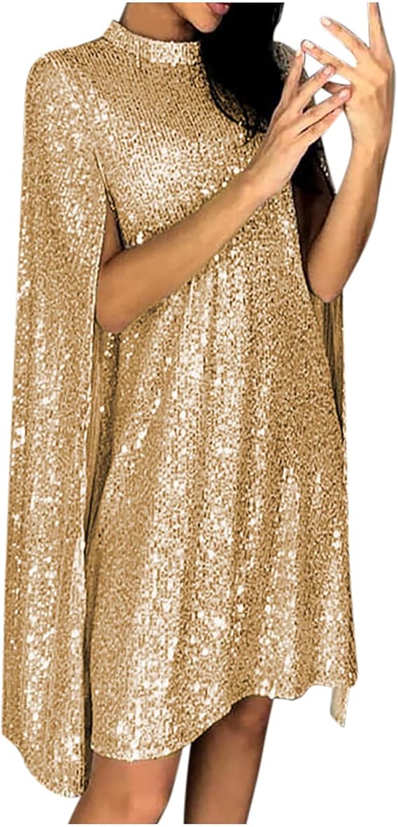 Gold Sequin Dress for Women's Cloak Long Sleeve Mini Cape Dress Party T-Shirt Skater Dresses Gift for Women