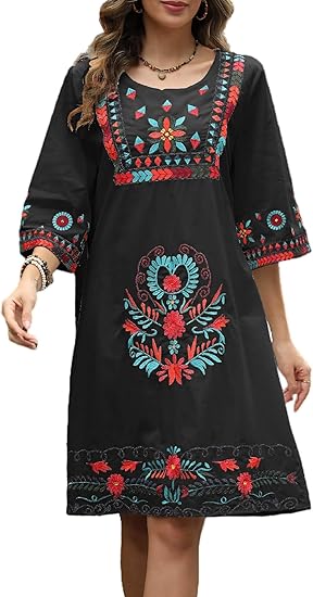 Mexican Embroidered Fiesta Dress, Traditional Boho Dress for Women, 3/4 Sleeve Casual Floral Bohemian Peasant Dress