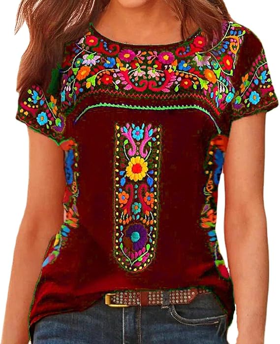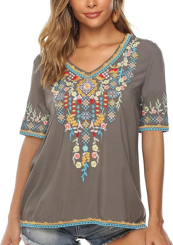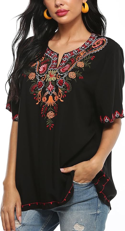 Mexican Embroidered Tops for Women Bohemian Peasant Shirts Boho Tunic Traditional Clothes Floral Fiesta Blouse