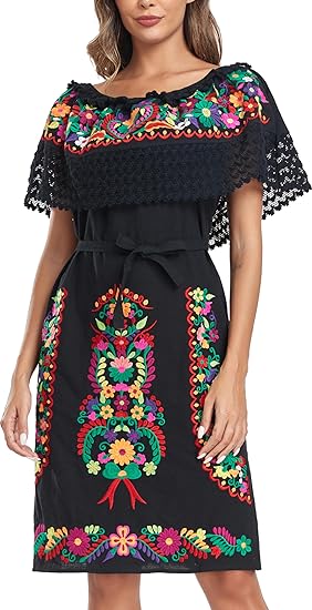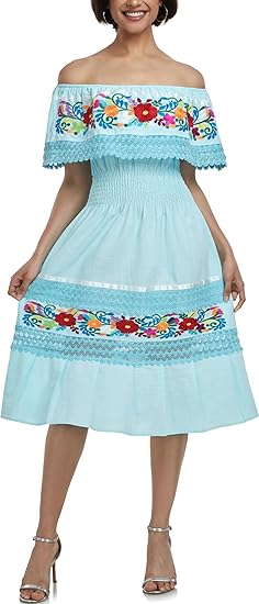 Mexican Dress for Women Embroidered Traditional Boho Theme Fiesta Floral Lace Off-Shoulder Ruffle Party Dress