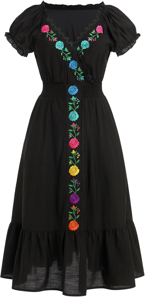 Women Mexican Dress Floral Embroidered Traditional Fiesta Dress Summer V-Neck Short Sleeve Cinco De Mayo Party Dresses