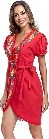 Women's Mexican Floral Embroidered Wrap Dress V Neck Short Sleeve Boho Beach Dress