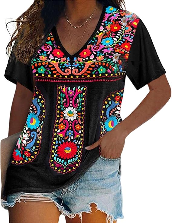 Mexican Shirts for Women Traditional Embroidered Tunics Womens Summer Floral Short Sleeve T Shirts