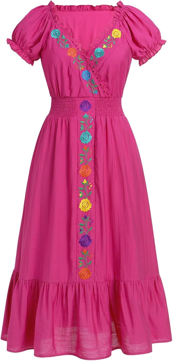 Women's Mexican Embroidered Dress Ruffle Wrap V-Neck Smocked Waist Floral Embroidery Casual Dress