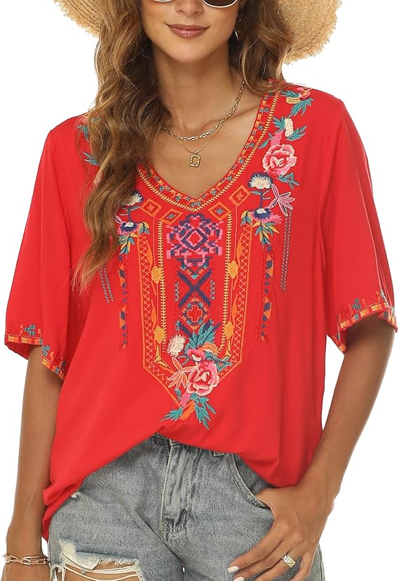 Mexican Embroidered Tops for Women Summer Short Sleeve Boho Shirts Peasant Blouses, Loose Fitting Bohemian Top Hippie Clothes