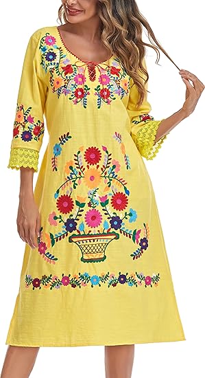Women's Casual Boxy Fit Skirts Mexican Embroidered Peasant Dresse