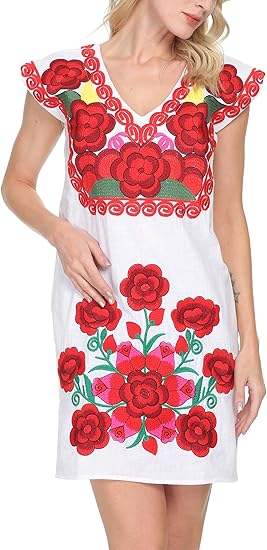 Womens Short Dress Mexican Embroidered Short Sleeves Cover Up