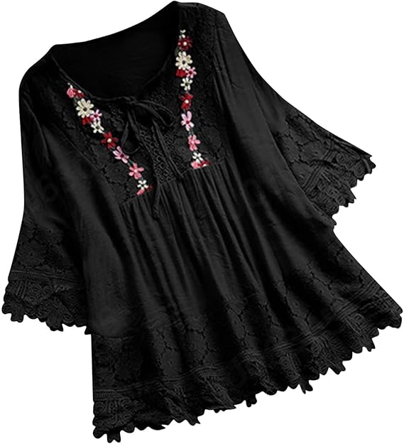 Embroidered Tops for Women Plus Size Vintage Lace Patchwork Bow V-Neck Tops Half Sleeve Boho Cute Mexican T-Shirt